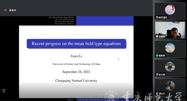 讲座中,李嘉禹教授首先从Chern-Simons-Higgs模型谈起,然后介绍了平均场型方程以及平均场型流的研究背景和重要研究进展,最后介绍了如何利用变分方法和几何流方法去解临界情形的Q-曲率问题。李嘉禹教授的报告精彩生动,在听众中引起了热烈的反响。报告结束后,李嘉禹教授同我院程新跃教授、李体耀博士、胡亭曦博士等参加报告会的学者就相关问题在线开展了热烈的交流讨论。