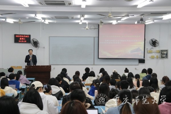 为深入学习宣传贯彻党的二十大精神,扎实推动习近平新时代中国特色社会主义思想“三进”工作,3月8日晚,校党委书记曾礼在弘德楼15204教室讲授《习近平新时代中国特色社会主义思想》全校通选课第九期线下第一讲,来自全校13个学院的近150名学生参加课程。