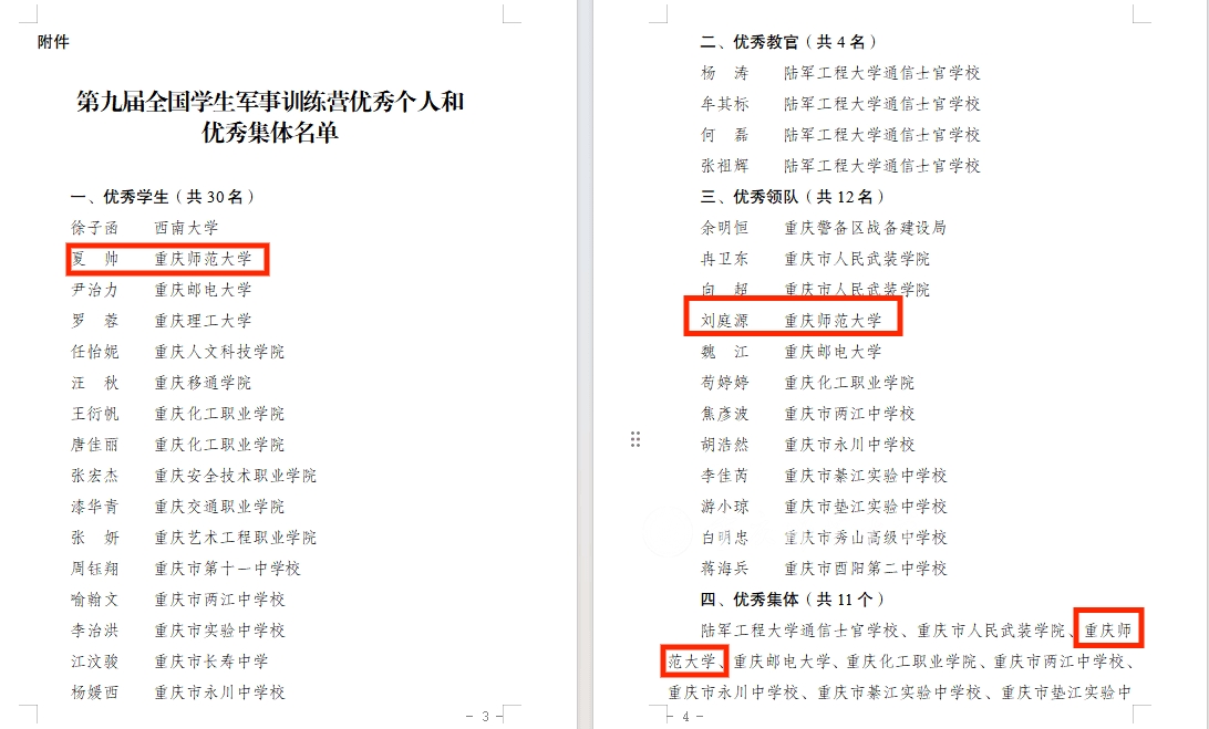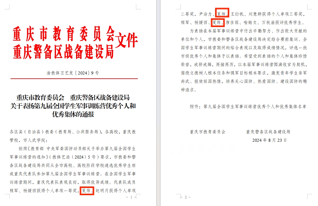 近日,重庆市教育委员会、重庆警备区战备建设局公布《关于表扬第九届全国学生军事训练营优秀个人和优秀集体的通报》,拉斯维加斯官网体育与健康科学学院夏帅同学获得个人单项二等奖1项、个人三等奖1项,并获评“优秀学生”;体育与健康科学学院刘庭源老师获评“优秀领队”;学校获评“优秀集体”。