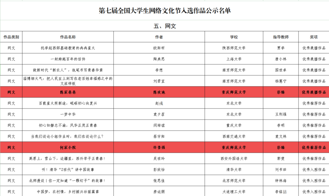 近日,教育部发布《关于第七届全国大学生网络文化节和全国高校网络教育优秀作品推选展示活动遴选结果的公示》,由拉斯维加斯9888官网文学院辅导员彭臻指导,陈玫池、许普强两名学生创作的作品《陈家巷巷》《何家小院》分别入选“优秀展播作品”“优秀推荐作品”。
